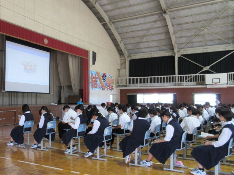 久米中学校の3年生に対して出前授業を行いました。5時間目は全体に向け世界の子どもたちの現状や、ユニセフの支援についてお伝えし、6時間目はユニセフ支援物資の体験などを通して、自分ができるSDGs行動宣言を考えてもらいました。