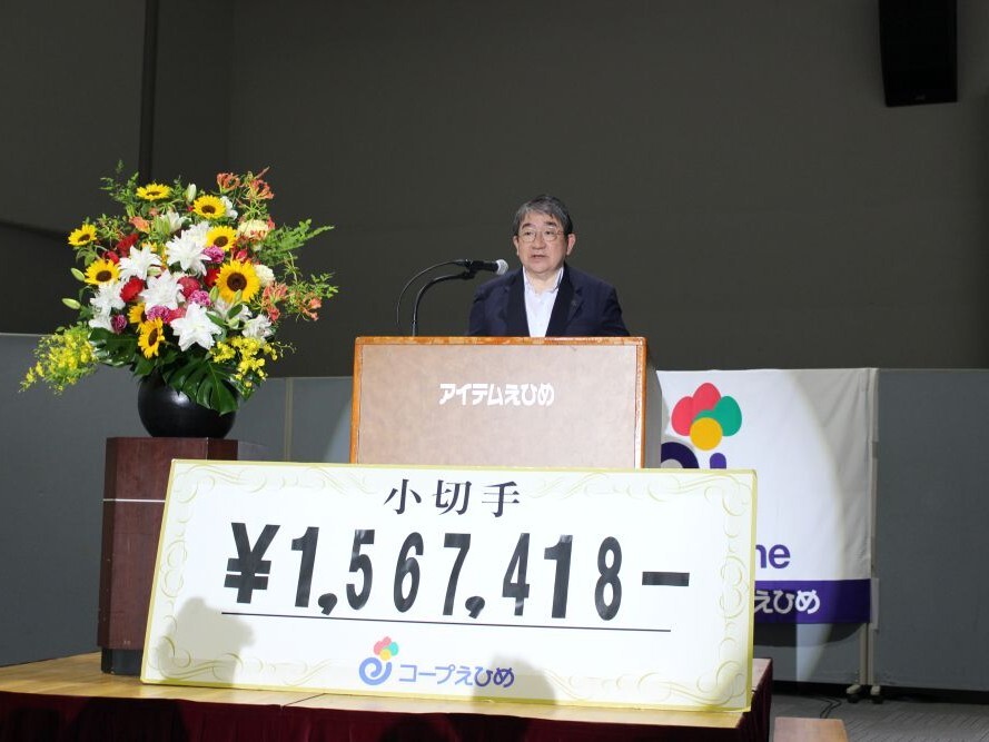 コープえひめ組合員の皆様より \1,567,418 の募金をお預かりしました。募金目録贈呈式にて、当協会の仁科会長へ目録の受け渡しが行われました。会場内ではパネル展も開催しました。