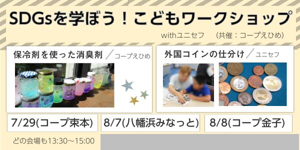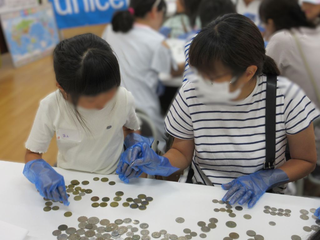 コープえひめと共催で、夏休み企画を開催しました。コープえひめは、アップサイクル体験(保冷剤を使用した消臭剤作り)、愛媛県ユニセフ協会はユニセフボランティア体験(外国コイン仕分け)をしていただきました。外国コインに触れ、世界のことを知るきっかけとなれば嬉しいです。
