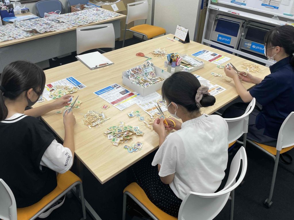 松山南高校のVYS、JRC所属の3名が事務所に来所。活動の一環として、使用済み切手の整理ボランティアをしてくれました。今後も定期的に活動してくださるそうで、楽しみです。