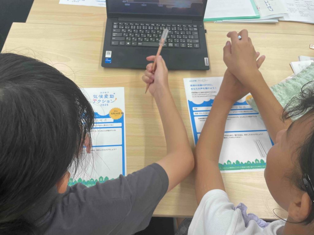 夏休みのボランティア体験として小学生の2人が体験に来てくれました。「ユニセフ気候変動アクション2025」の動画をみて、気候変動アクションの意見を書いてくれました。