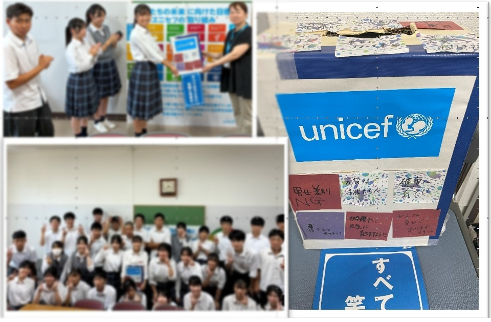 東雲祭内でユニセフの活動に取り組んでくれました。当日はSDGsパネルやルーレットの展示、また使用済み切手整理のボランティアも行われました。生徒の皆さんが手作りしてくれた募金箱に入っていた8,685円は、全額ユニセフ募金としてお預かりしました。ご協力ありがとうございました。